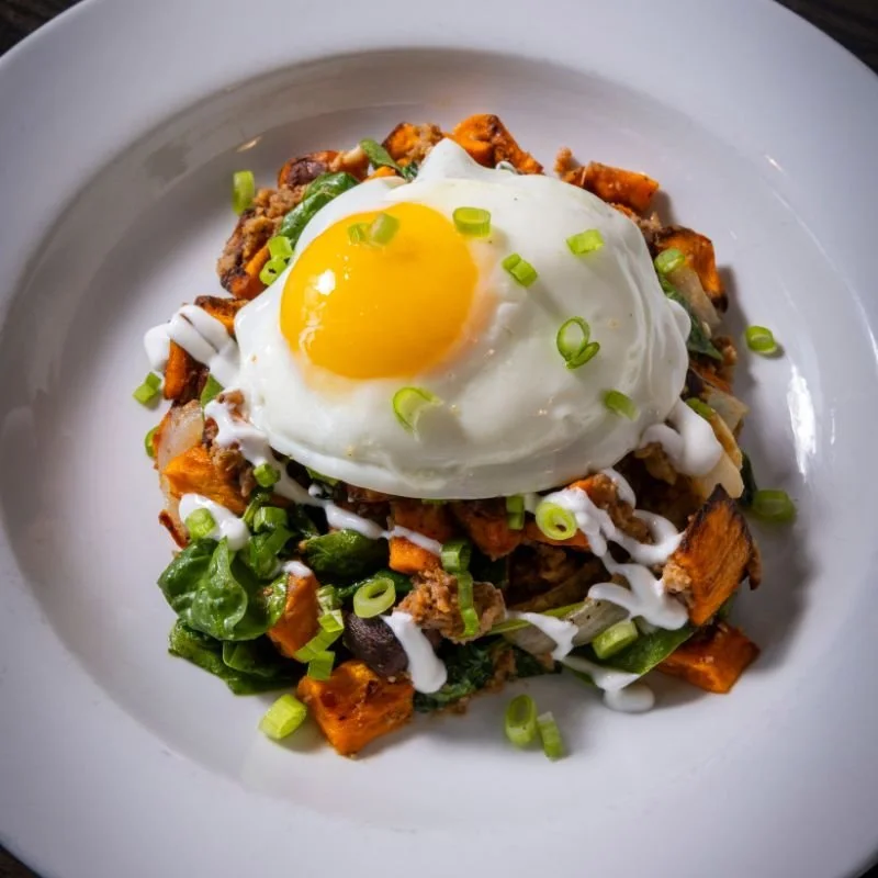 roasted sweet potatoes, fresh spinach, sausage, mushrooms, caramelized onions, crèma, green onion,